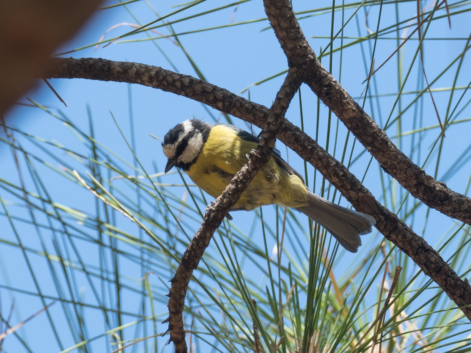 On meeting Daniel and Oscar we jumped into their 4x4 and were soon winding up the hills towards our target bird high in the pine forests near to La Culata.  Much of the pine forests have been replanted after deforestation but it is notable to the eye that some of this is too dense and the pines long and spindly, prone to fire, and lacking the underscrub required by the Gran Canaria Blue Chaffinch. We stopped low down at a Gran Canaria Blue Chaffinch territory with no luck but did see Canary Island Chiffchaff and Great Spotted Woodpecker of the endemic subspecies thanneri. After spending some time at a view point, Mirador del Pico de los Pozos de la Nieve, where Island Canary was common we headed slightly downslope near to the campsite at Llanos de la Pez to try for the Blue Chaffinch. After a short while a  Blue Chaffinch called and there above us was a male Gran Canaria Blue Chaffinch, we watched the bird for some time and eventually the bird came to the ground to feed on the seeds of Canary Island Pine Pinus canariensis where it showed incredibly well and was joined by the distinctive canariensis subspecies of Common Chaffinch and eventually by a second Blue Chaffinch. Here we also saw Canary Island Chiffchaff, Great Spotted Woodpecker and the endemic subspecies hedwigii of African Blue Tit. We wandered back to the car picking up a further two male Gran Canaria Blue Chaffinch.